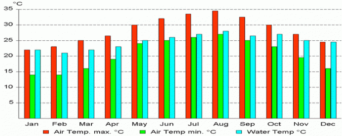 Generell herrscht in Safaga ein warmes Wüsten-Klima. Es gibt im Wesentlichen zwei Jahreszeiten – den Sommer von April bis Oktober und den Winter von November bis März. In den Sommer-Monaten ist es tagsüber bis ca. 35° warm, während es in der Nacht auf 20-25° abkühlt. Im Winter liegen die Tagestemperaturen zwischen 20-25° und können nachts bis auf etwa 15° absinken.