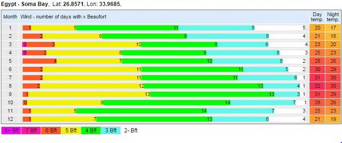Dagegen sorgen kräftige Winde praktisch ganzjährig für gute bis sehr gute Kite- und Windsurf-Bedingungen. Am Morgen startet der Wind meist aus nord-westlicher Richtung und weht daher an den Stränden von Safaga seitlich ablandig. Gegen Mittag dreht er dann auf Nord und bläst perfekt "sideshore" entlang der Küste. Bis 14/15 Uhr hat man meist einen sehr beständigen Wind, der danach – je nach Jahreszeit – langsam abflaut, oder auch bis Sonnenuntergang durchblasen kann.